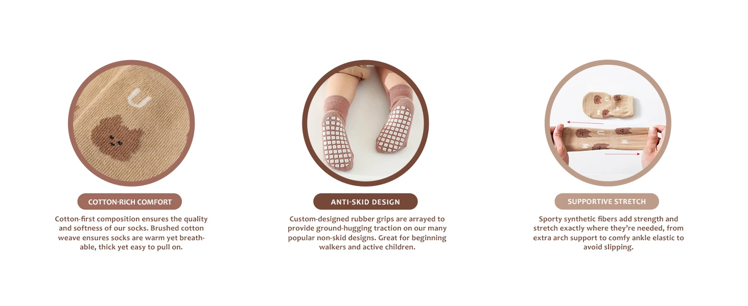 These toddler anti-slip socks are made of 89% cotton, 9% polyester and 2% spandex, so they are really soft.