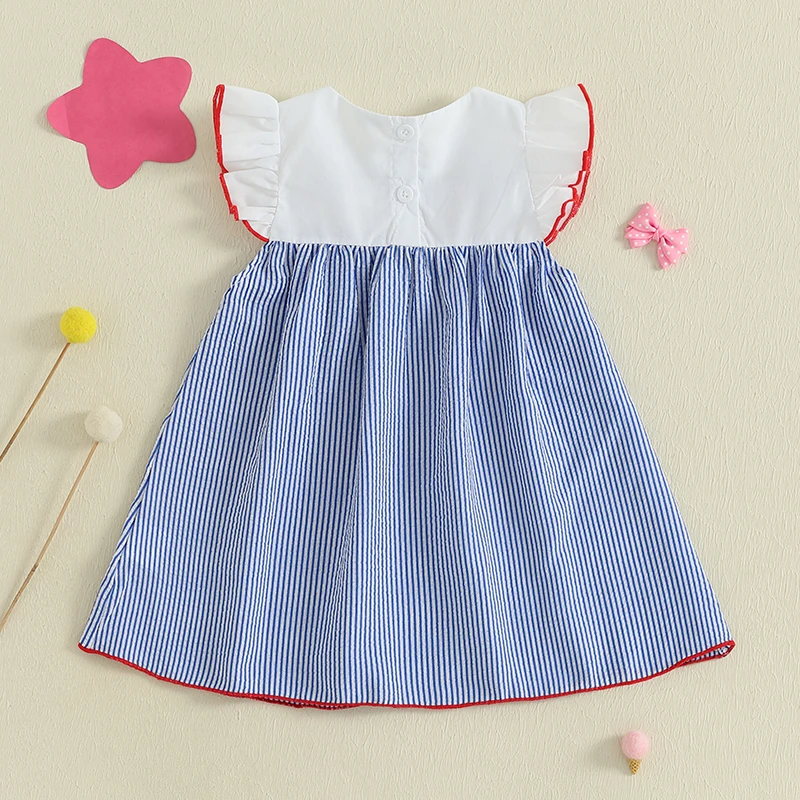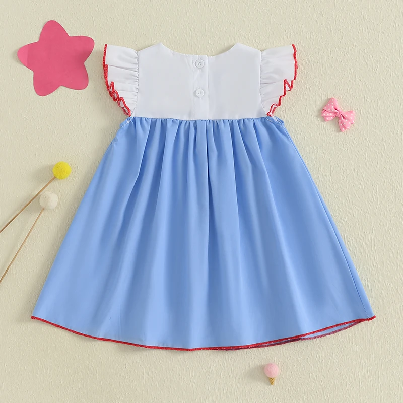 Toddler Girls Dress 4th of July Clothes Flag Embroidered Round Neck Fly Sleeve Casual Dress Kids Summer Dress