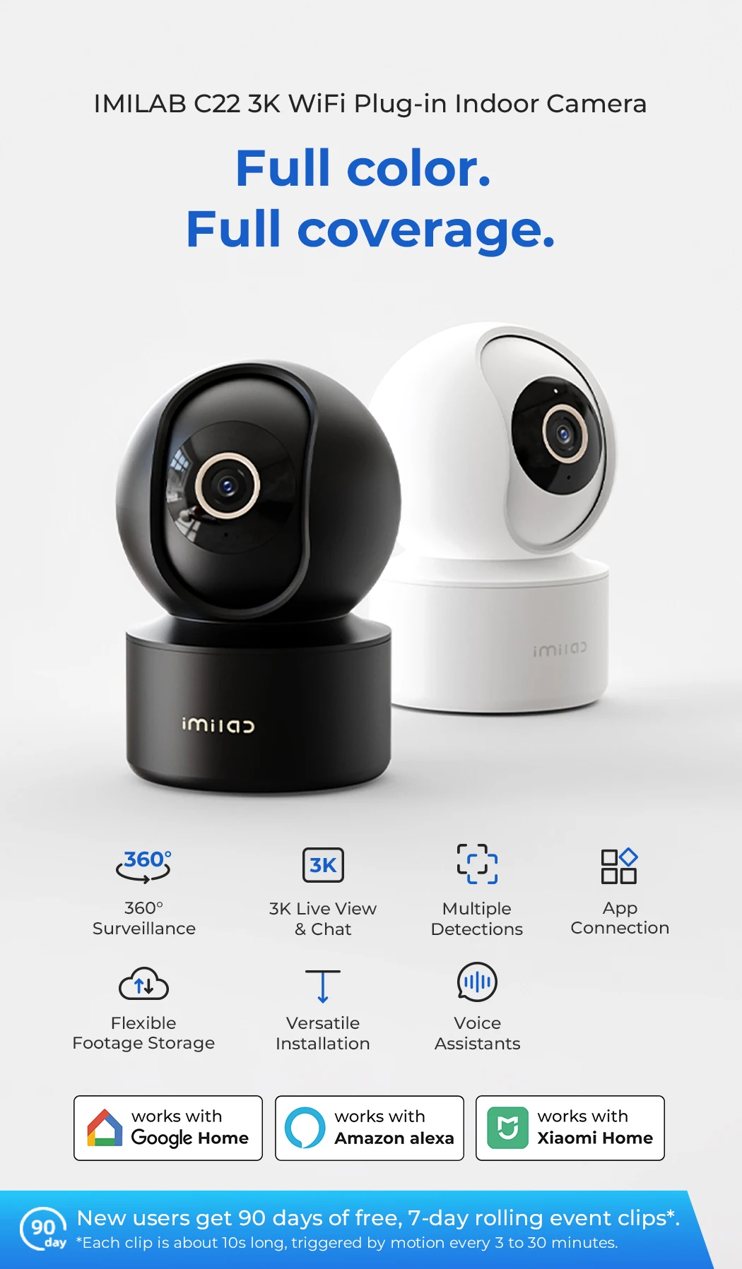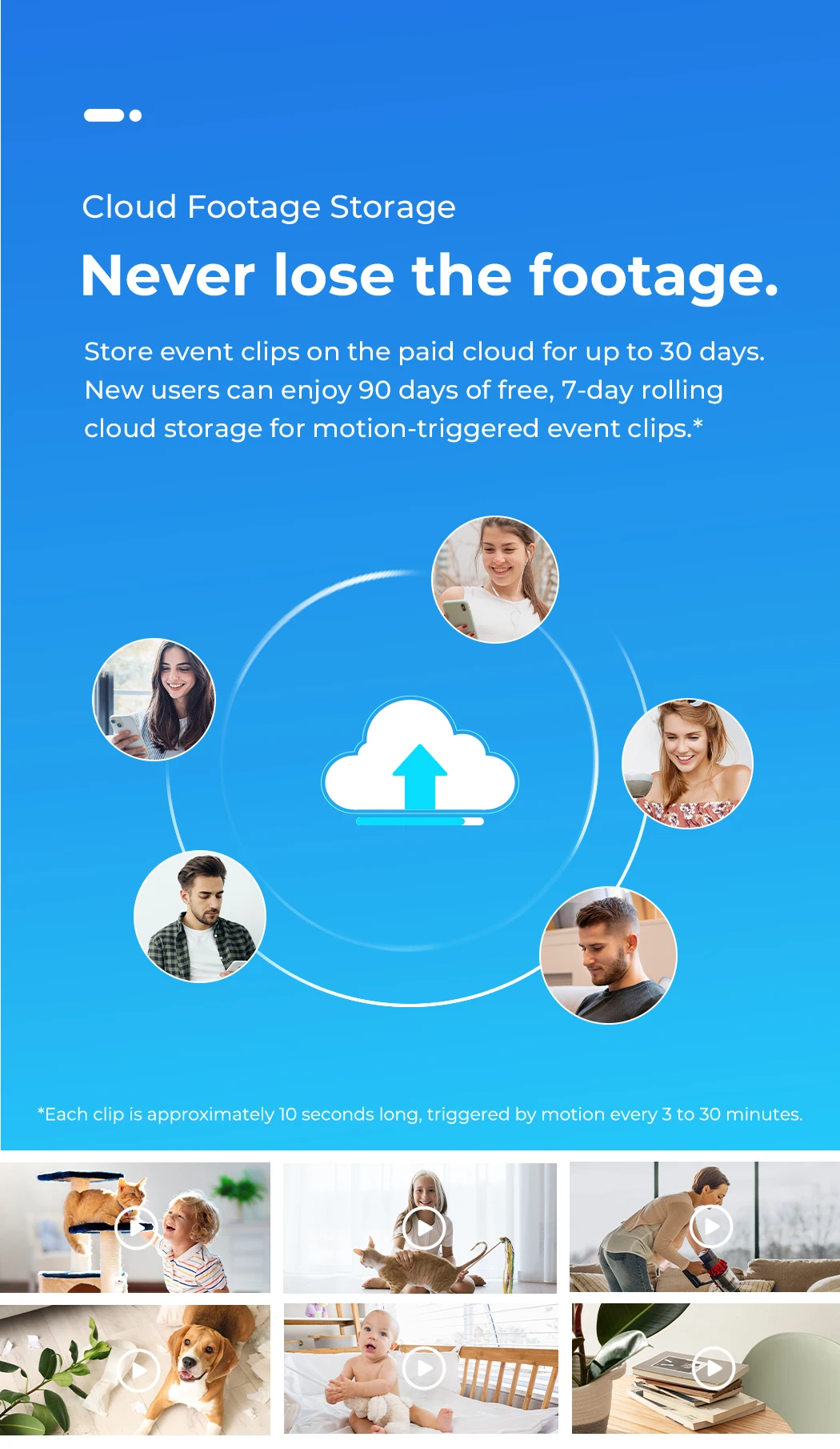ã€Free Event Clip】New users get 90 days of free, 7-day rolling event clips. Each clip is about 10s long, triggered by motion every 3 to 30 minutes.