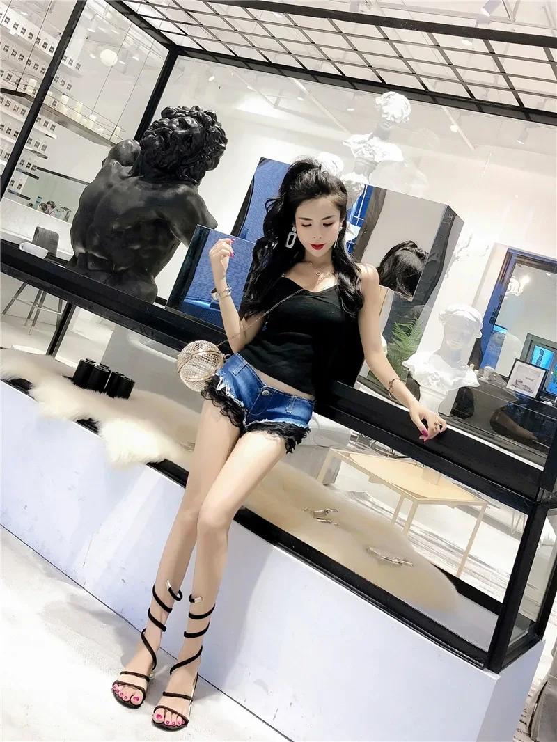 Pure Desire Sweet Spicy Girl Denim Shorts Lace Stitching Super Low Waist Sexy Hot Pants Slimming Women’s Versatile Super Shorts