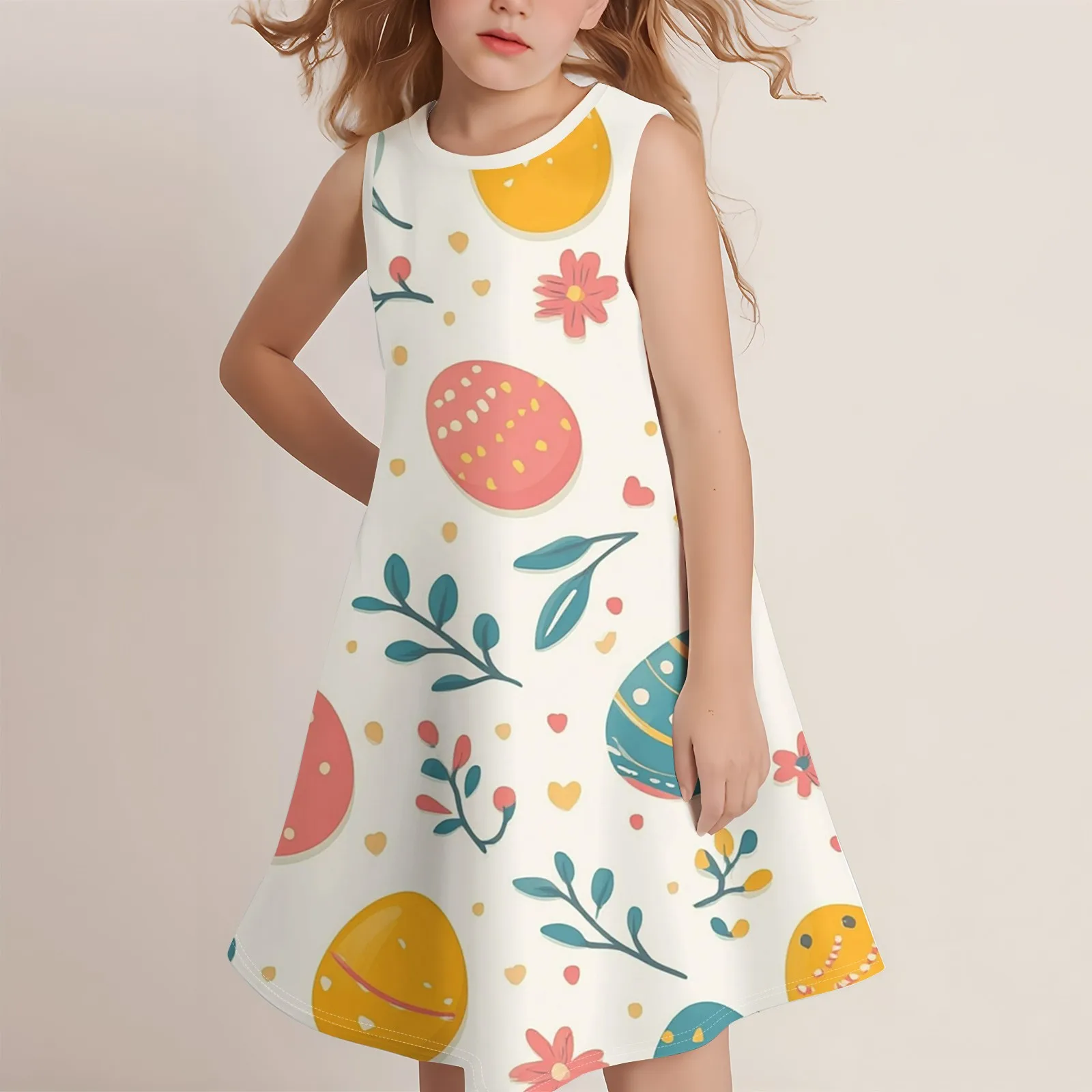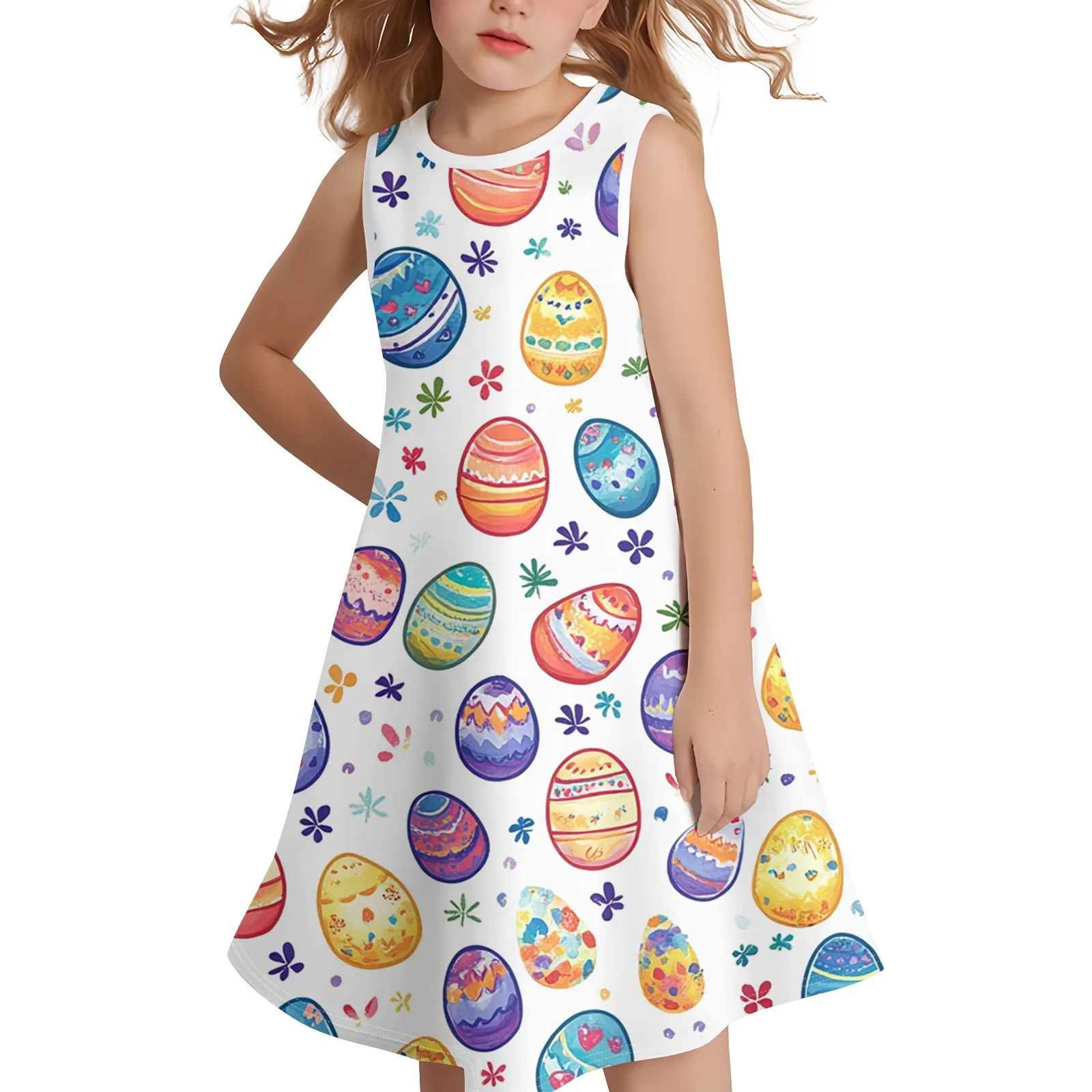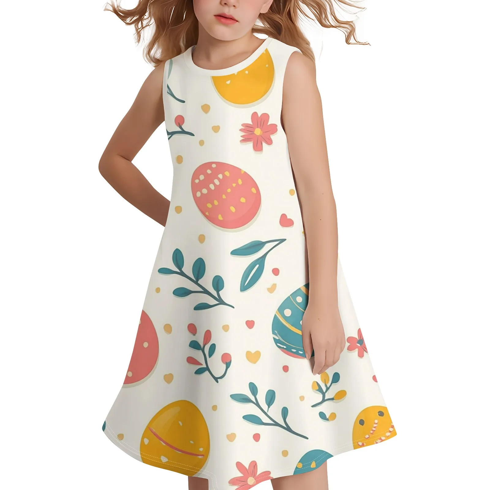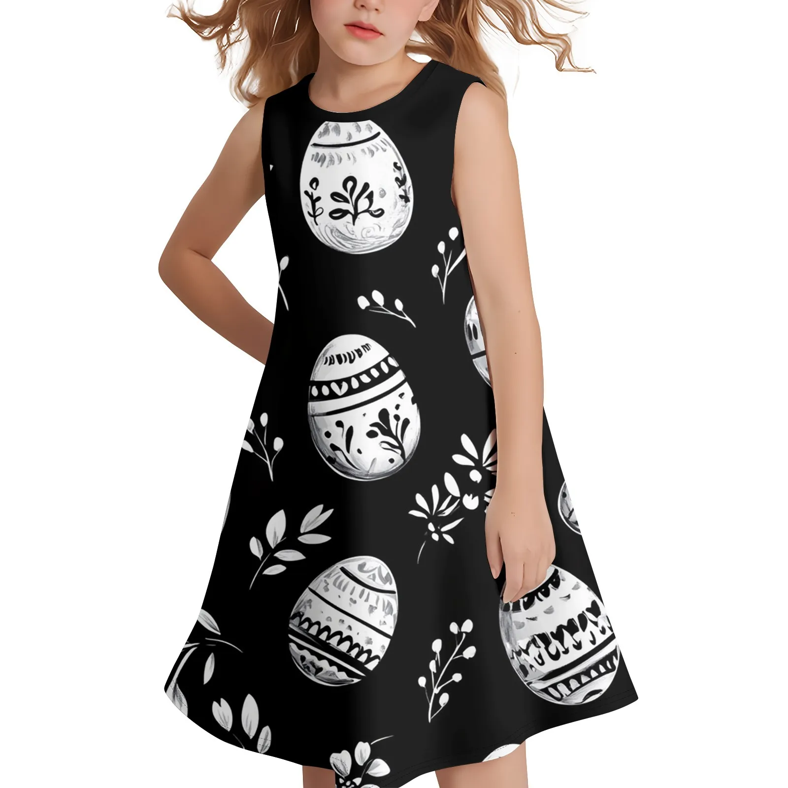 Girls Fashion Casual Sleeveless Round Neck Easter Printed Dress